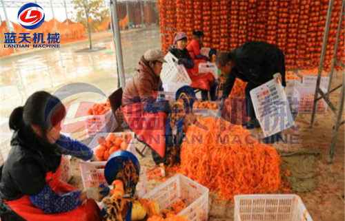 柿餅加工工藝流程:選果→去皮→裝盤→第一次烘烤→???rarr;第二次烘烤→停烤→第三次烘烤→???rarr;真空包裝→入庫(kù)。