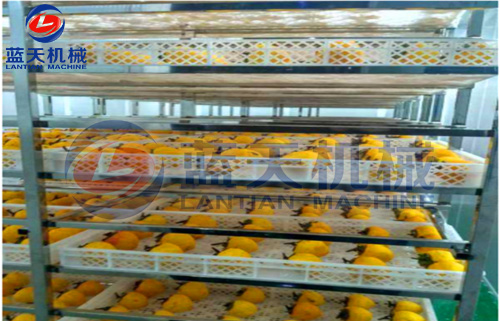 4:第一次烘烤 柿果進(jìn)入柿餅烘干機(jī)后,迅速升溫至40——50°c,使柿果內(nèi)乙醇脫氫酶活性處于最高狀態(tài)。內(nèi)呼吸也加強(qiáng),借以快速完成軟化,脫澀和部分脫水(25%左右),持續(xù)時(shí)間約12h,視柿果大小,成熟度靈活掌握。干燥柿餅時(shí),防霉十分關(guān)鍵,稍有不慎,即會(huì)在幾個(gè)小時(shí)內(nèi)造成整個(gè)烤房中的柿果霉?fàn)€損失。因此,需要使烤房?jī)?nèi)的相對(duì)濕度始中保持在70%以下,可有效防止柿果霉變。
