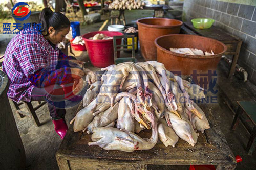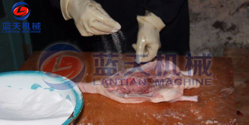 鴨只屠殺之前應予12~24小時絕食,并給以充分清水,使之安靜休息。如此可使屠殺放血良好,并可減少未完全消化的飼料污染屠體的機會。經屠殺后,將屠體外表洗凈,祛除余毛,并應即速冷卻。鴨之屠體選用無骨折及瘀血斑點者,并將鴨只在肘關節(jié)及跗關節(jié)下端分別將兩翅及兩腳去掉。以左手抓住鴨之下額骨,右手持刀從口腔割掉帶舌的下額部,此處理俗稱割外五件。