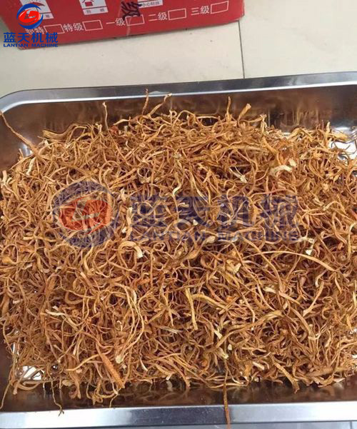 分級烘干處理過程中,有碎草產(chǎn)生和桔黃色子囊孢子粉,要分別凈選包裝以利增值收益。