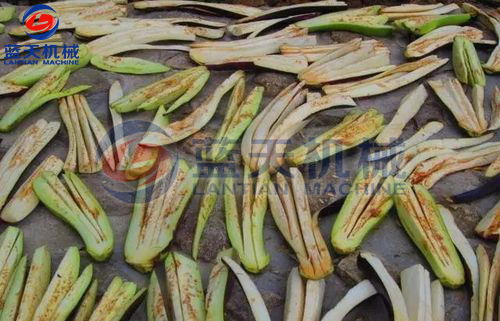 8.浸泡、烘干 將干茄瓣放在清水里浸泡20分鐘左右,讓其吸水膨脹變軟。然后用笊籬撈出,再放到烘干房?jī)?nèi)進(jìn)行烘干,烘干溫度可以設(shè)定在60-65度之間。烘干至茄瓣表皮無(wú)水汁,質(zhì)量比剛浸泡完時(shí)略有減少,但仍較半成品重45%——50%時(shí)為宜。浸泡的目的是為了脫去部分鹽分及茄子的苦澀味。