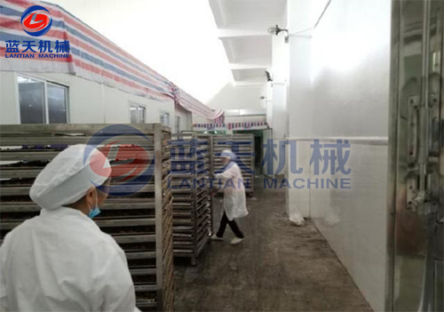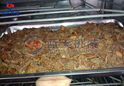 紅糖烘干工藝:將紅糖磚切成方塊狀,置入托盤中,在物料架中分層放好,注意層與層之間的距離,將物料車推入烘干房,開始啟動溫濕控制系統(tǒng),在紅糖烘干機的使用過程中,第一個小時可以只升溫不排濕,因為在工作的第一階段,烘干房里面的濕度很低。第二階段設(shè)定為烘干加排濕的工作程序模式。紅糖烘干機帶有余熱回收功能。在排濕過程中的熱量會重新參與到烘干房的熱循環(huán)。排濕過程當中不會造成熱量浪費,從而降低了運行成本。