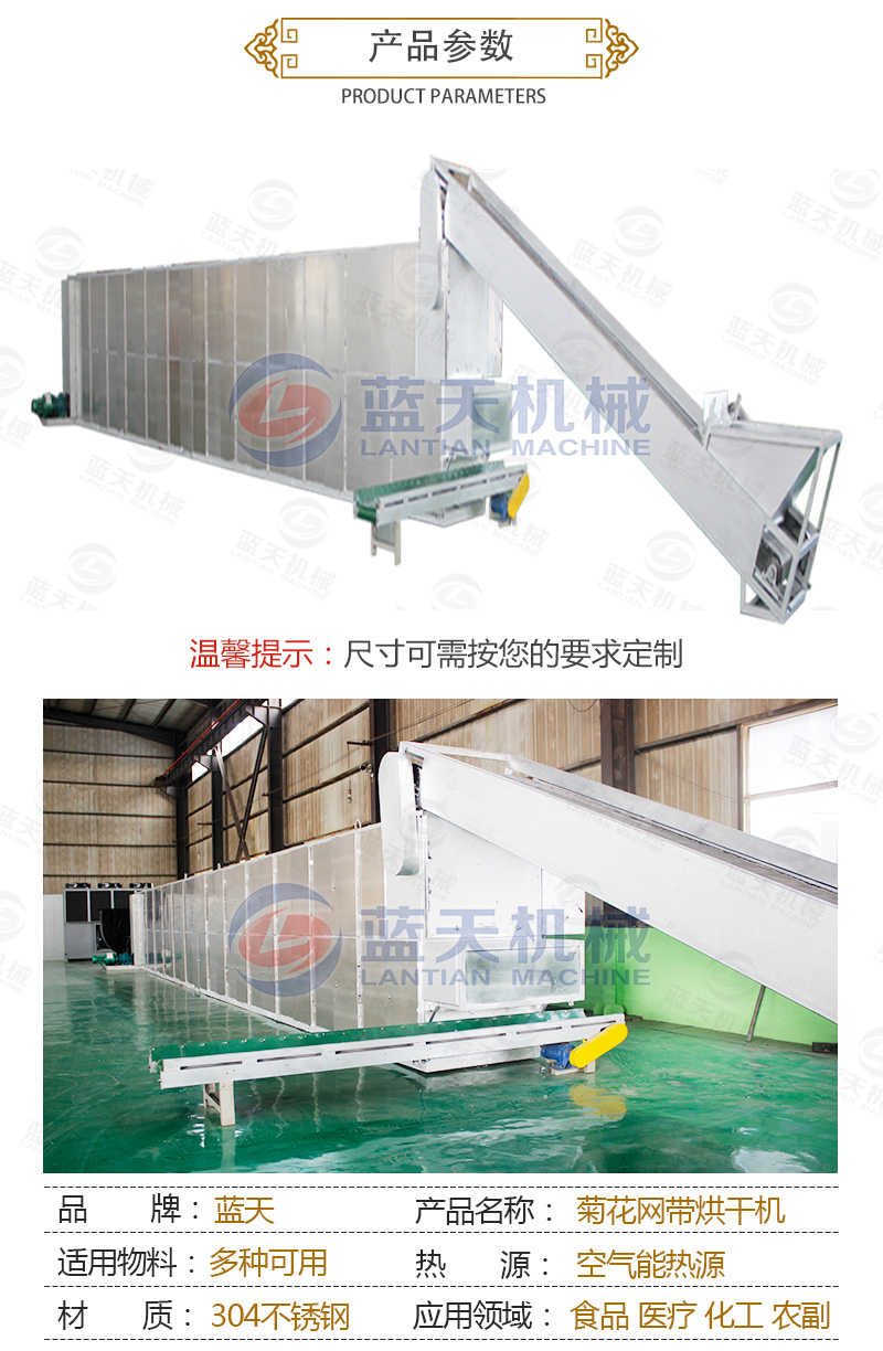 隨著生活水平的提高和壓力的增大,人們都逐漸注意養(yǎng)生,干菊花的市場(chǎng)是很大的。干菊花大多用于泡茶飲用,具有味濃香甜、去膩消食、醒腦益神之功能。菊花收獲的旺季,一直靠天晾曬菊花的菊農(nóng)就怕遇見陰雨天。隨著社會(huì)的進(jìn)步,科技的發(fā)展,智能烘干設(shè)備越來越深得用戶的滿意,菊花網(wǎng)帶烘干機(jī)讓菊農(nóng)徹底擺脫了靠天烘干收獲菊花的苦惱。同時(shí)牽扯到人們食用,菊花網(wǎng)帶烘干機(jī)工藝要求就很是嚴(yán)格的,因?yàn)楹芏嗑栈ㄐ枨笊虒?duì)于烘干后的菊花的色、香、形、味要求很高,要求干燥烘干后的菊花原色、原味、原樣,這就要求菊花成熟后烘干,菊花頭部分進(jìn)行強(qiáng)干燥烘干,而對(duì)菊花花瓣部分進(jìn)行弱干燥烘干。我們藍(lán)天菊花烘干機(jī)設(shè)備廠家主營(yíng)的烘干機(jī)采用智能化控制溫度,全自動(dòng)免人工操作,省時(shí)省力,讓菊花客戶打心里贊同和喜歡。