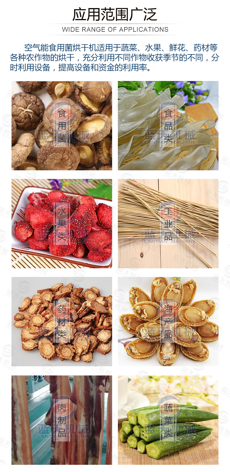 食用菌是指子實體碩大、可供食用的蕈菌(大型真菌),通稱為蘑菇。中國已知的食用菌有350多種,其中多屬擔子菌亞門,常見的有:香菇、草菇、蘑菇、木耳、銀耳、猴頭、竹蓀、松口蘑(松茸)、口蘑、紅菇和牛肝菌等;少數屬于子囊菌亞門,其中有:羊肚菌、馬鞍菌、塊菌等。上述真菌分別生長在不同的地區(qū)、不同的生態(tài)環(huán)境中。批量生產食用菌干品需要用到食用菌烘干機。