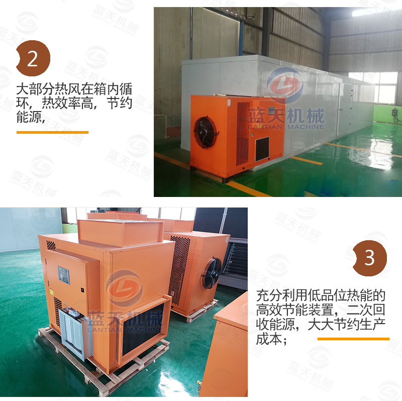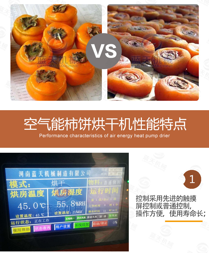 傳統(tǒng)的柿餅的生產(chǎn)周期傳統(tǒng)的自然晾曬所需要的一月有余,而采用熱泵柿餅烘干機(jī)則縮短到4-5天(根據(jù)使用時(shí)的溫濕度確定),并且在質(zhì)量上優(yōu)于自然涼曬的柿餅。在脫澀期溫度不能超過(guò)45度,濕度保持32%上下;前期烘烤期排濕不能太大,以免結(jié)皮太早以及影響回軟過(guò)程;第一次捏餅,第二次捏餅,手要輕,力要?jiǎng)?!大量脫水期溫度不能超過(guò)65度,濕度不能高于45度。統(tǒng)而言之為“兩烘兩停三捏”的全自動(dòng)控制烘干方法。