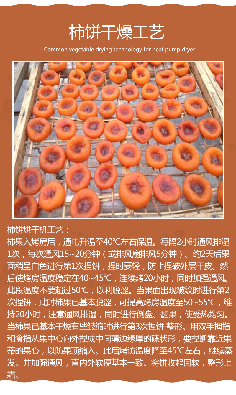 目前,國(guó)內(nèi)柿餅烘干加工工藝主要采取自然干制的傳統(tǒng)民間加工工藝。其主要流程為選果、去皮、日曬壓捏、脫色、捏曬整形、定型出霜然后包裝。由于自然干制的方法生產(chǎn)周期長(zhǎng),同時(shí)因長(zhǎng)達(dá)數(shù)月的自然晾曬,微生物污染嚴(yán)重,因此產(chǎn)品的衛(wèi)生質(zhì)量差,自然干制還有占地多、用人多、用時(shí)長(zhǎng)等缺點(diǎn),我們對(duì)柿餅用熱泵烘干的進(jìn)行研究,有了柿餅烘干機(jī)的產(chǎn)生,并取得突破性的成果。