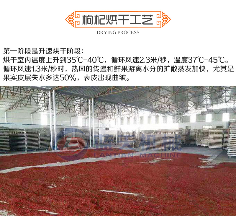 高濕低溫段,溫度小于50度,范圍40度~50度,避免高溫高濕造成枸杞顏色的變化,觀察枸杞表面水汽變化,隨時(shí)排潮,這段時(shí)間應(yīng)在3~3.5小時(shí)。