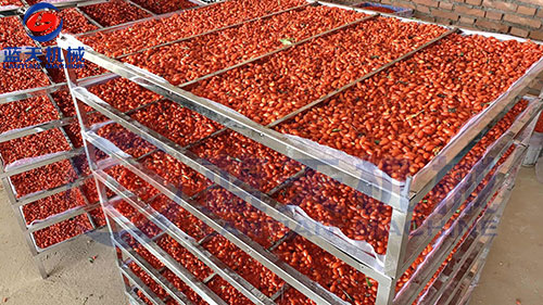 寧夏枸杞烘干機客戶烘干枸杞現(xiàn)場,客戶先把新鮮的枸杞鋪在物料托盤上,枸杞鋪好后,將物料盤推進寧夏枸杞烘干房設(shè)置好對應(yīng)的烘干參數(shù)進行烘干。